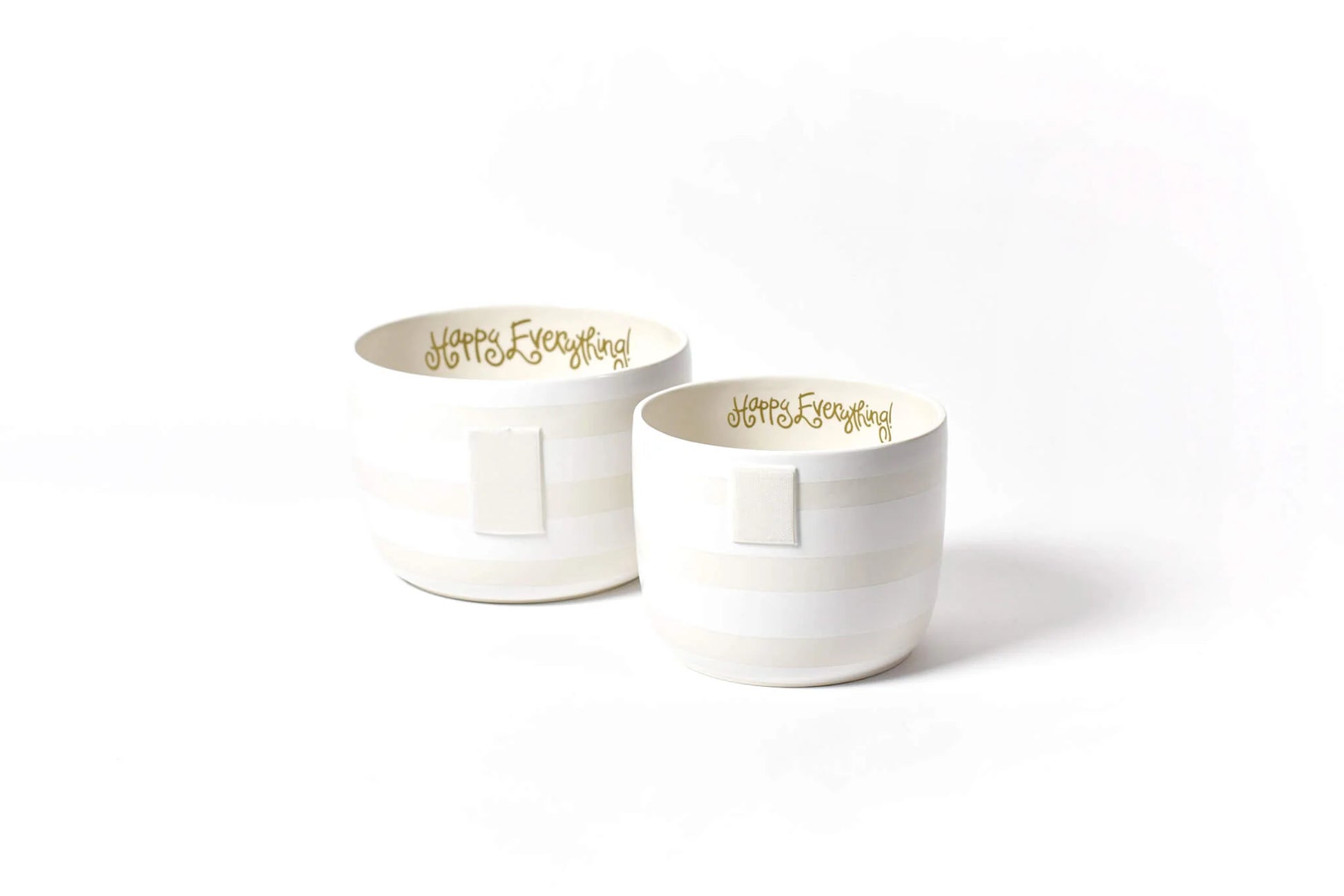 Our White Stripe Happy Everything!™ Mini Bowl is the perfect combination of style and function. Attach any of the Mini Attachments to the front with hook-and-loop to add a little happy to everything! Perfect for floral arrangements, serving your favorite dish, using as a drink chiller or even storing mundane items to make them elevated in style. The options are endless.